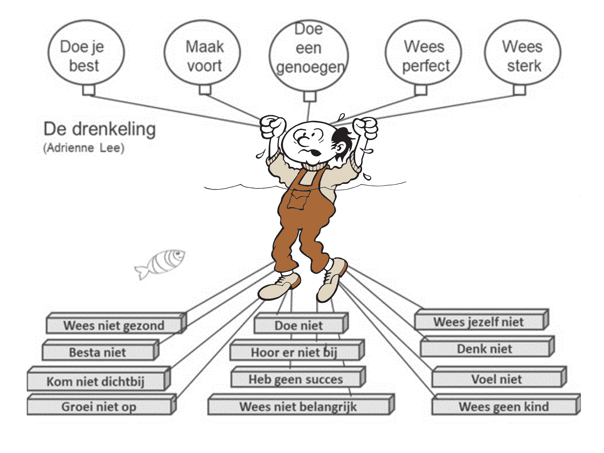 Wij hebben allemaal als kind boodschappen (nadrukkelijk opgelegd) gekregen waarin wij zijn gaan geloven. Dat noemen wij lodenbroodjes of stoppers. Dat zijn de 12 lodenbroodjes die je onder deze drenkeling ziet. Doorgaans compenseren we dat onbewust door 1 van de 5 drivers die je boven water ziet.